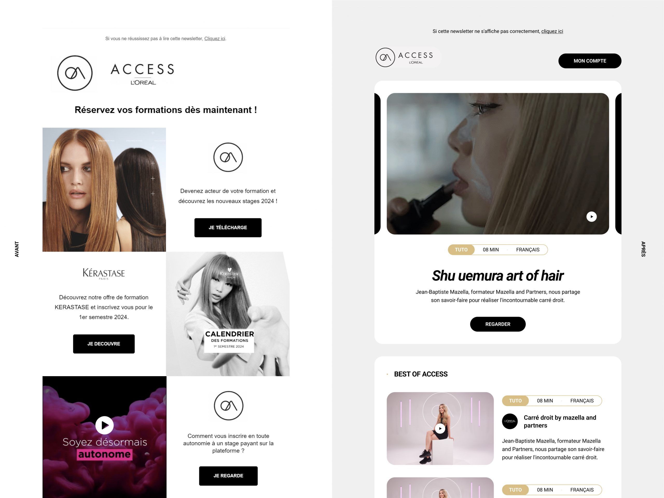 L’Oréal’s Access Platform, dedicated to training, was looking to modernize and optimize the impact of its email communications. The main objective was to highlight training videos, a key element of their content strategy, while offering an enhanced, adaptive and immersive user experience.